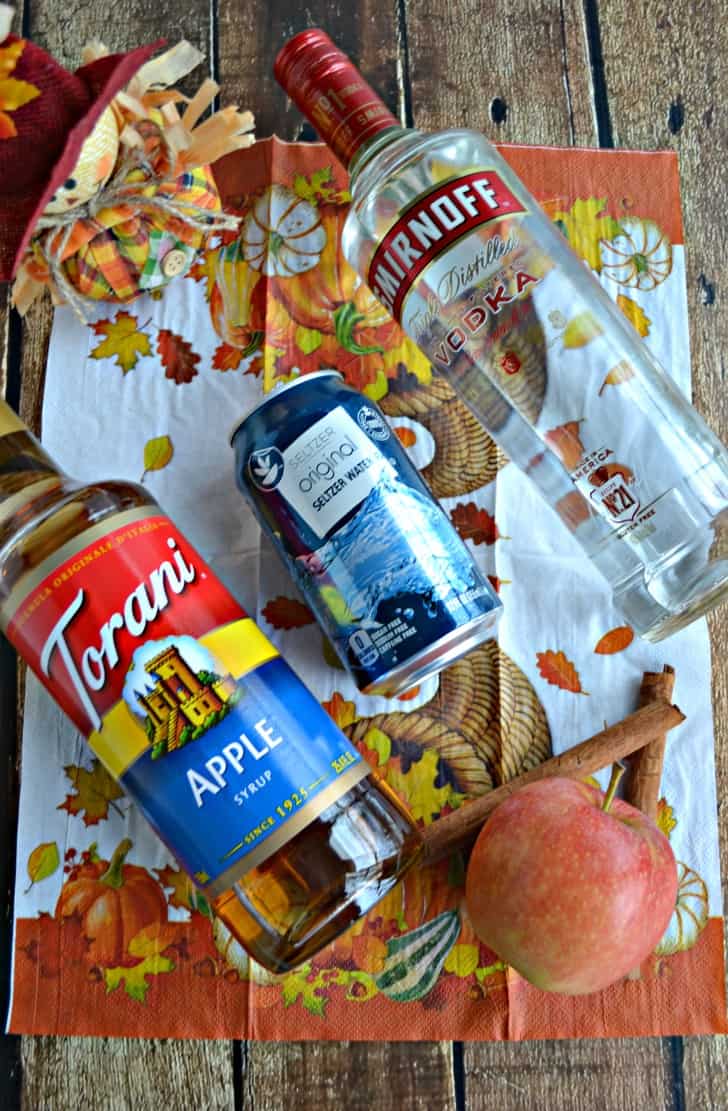 - In a shaker with ice combine the apple syrup, vodka, and cinnamon. Shake vigorously for 30 seconds. Set aside.