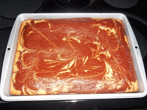 4.ย Pour batter by 3-4 T. onto the lazy daisy cake.ย Take a knife and swirl the chocolate cake into the yellow cake, making sure you can see the swirls and the yellow cake.