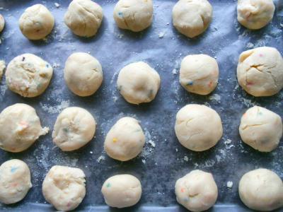 2.ย Slowly mix in the sweetened condensed milk and the colored sprinkles.ย Mix in the remaining powdered sugar until the batter is stiff and easy to handle.ย Add in additional powdered sugar if needed.