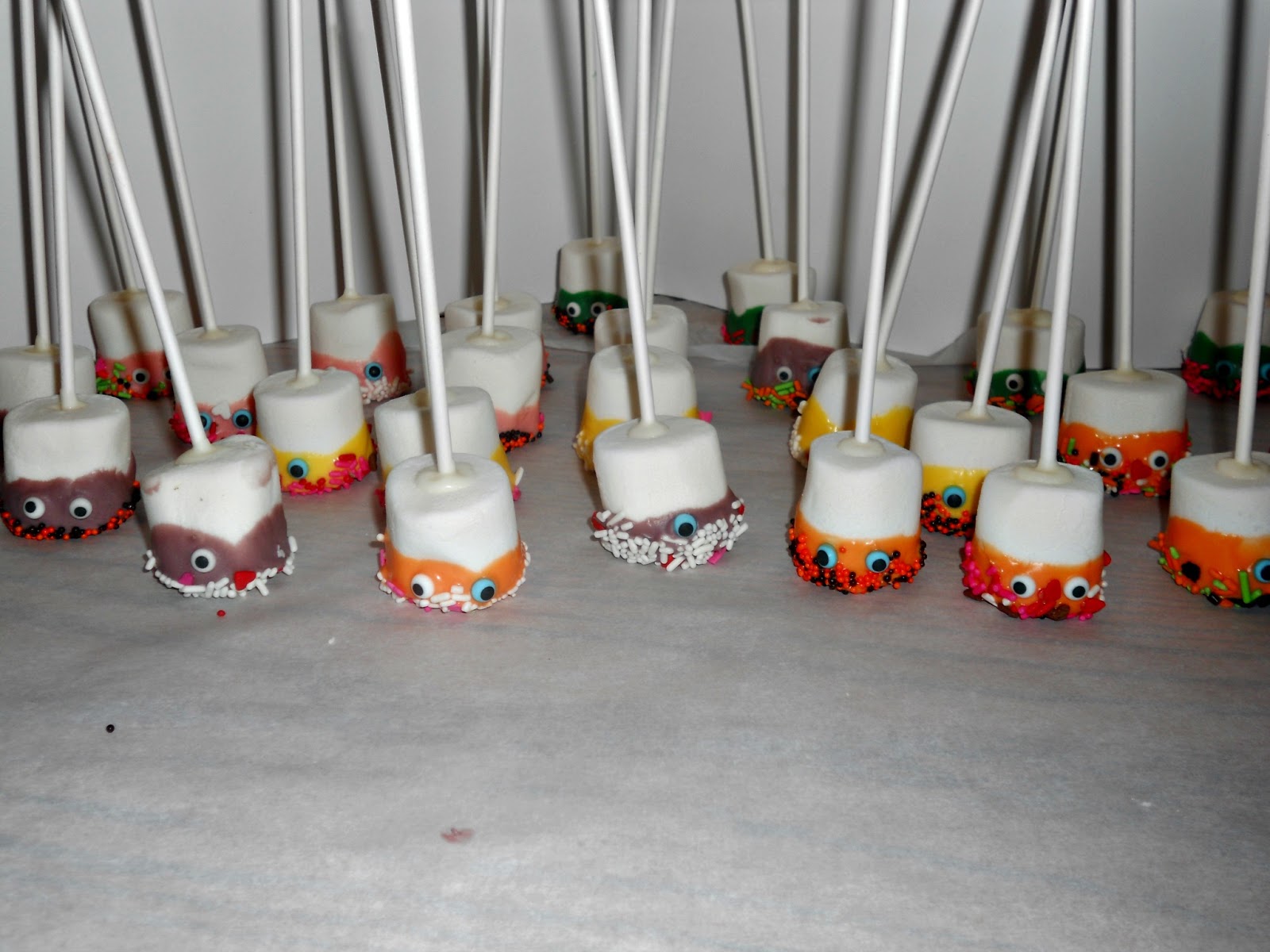 4.ย Working with one color of candy melts at a time, melt in the microwave at 30 second intervals until completely melted.ย Holding the marshmallow by the stick, dip it halfway into the colored chocolate.ย Immediately stick the top of the marshmallow into the sprinkles to make the “hair”.ย Add on candy eyes then set on waxed paper to harden.ย Repeat with remaining colors.