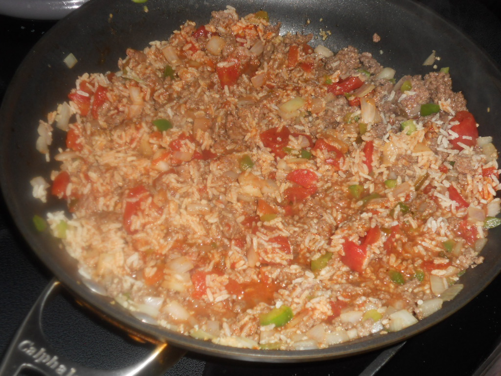 3.ย In a large skillet cook the ground beef,ย Worcestershire sauce, garlic, onion, bell pepper pieces, red pepper, salt, and black pepper.ย Cook for 10 minutes or until heated through.4.ย Remove from heat and stir in the rice and diced tomatoes.ย