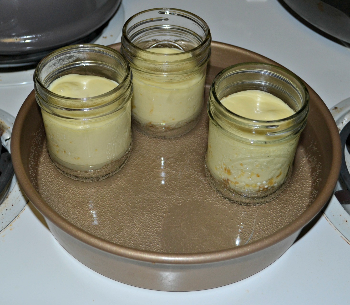 5. Place the 4 jars in a cake pan. Fill the cake pan 3/4 of the way with water. Bake the cheesecakes for 25 minutes.