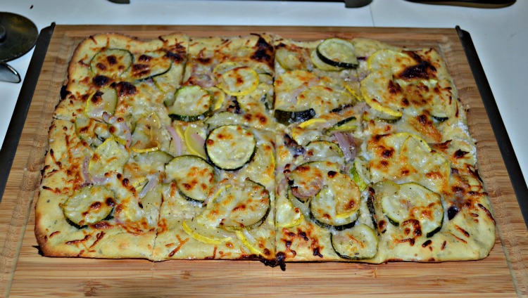 Then the next night I grilled the zucchini, yellow squash, and a red onion I had left over from last week. I put it on homemade pizza dough (made with King Arthur’s Gluten Free Flour) and pulled it thin on a baking sheet. I topped it with the grilled veggies and lightly sprinkled it with cheese. It was delicious and we really didn’t miss the sauce on it! The thin crust got crispy and the grilled veggies had enough flavor to carry the flatbread. The gluten free flour made for a really nice flatbread.