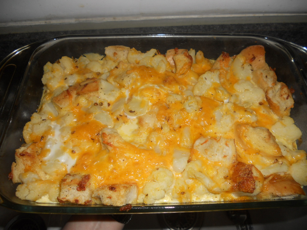 1. Preheat the oven to 300 degrees. Place the cubed bread on a baking sheet and cook for 15-20 minutes or until the bread is brown and crisp on the edges. Remove from the oven and then turn the oven up to 350 degrees.2. In a large skillet, saute the cauliflower in butter over medium high heat along with the caraway seeds. Heat until tender. Remove from heat and mix in the bread and cheese.