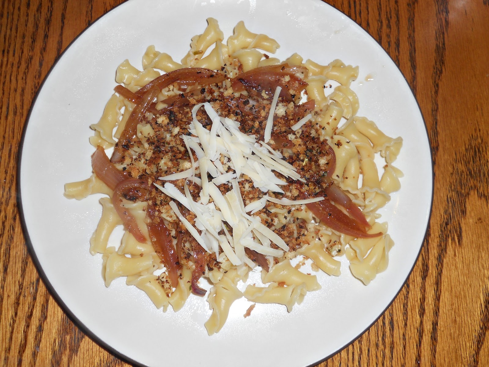 5. Divide pasta among plate, top with onion mixture, 2 tablespoons of panko, and Parmesan cheese.