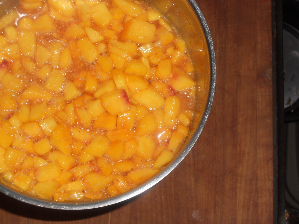3. In a large saucepan combine the peaches, sugar, ginger, lemon juice, orange juice, nutmeg, and lemon peel. Bring the mixture to a boil over medium high heat. Reduce the heat to low and simmer for 5 minutes.