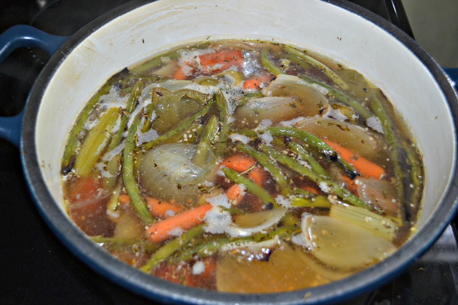 I found a great recipe where the vegetables are roasted first which really brings out their flavors.ย Then they are simmered in a pot of water and then strained out to make the stock.ย I was very happy with both the color of the stock and the taste of it.ย It was so much better then store bought stock and there are no preservatives in it.ย There is also very minimal salt in the stock.ย I ended up using some that night and filling three bags for the freezer.