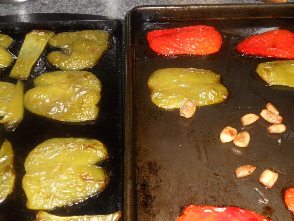 1.ย Preheat the oven to 400 degrees.ย Peel away the dry outer layer of the garlic bulbs and cut the tops of the bulbs off.ย Place the cut side up on a cookie sheet and drizzle with olive oil.ย Arrange the cut peppers on another cookie sheet, cut side down, and drizzle with olive oil.ย Cook for 40 minutes.2.ย Remove the peppers and garlic from the oven and place on a wire rack to cool for 20 minutes.ย Remove the garlic from the bulb and place in a food processor and add the peeled, cut tomatoes.ย Process until just slightly chunky.
