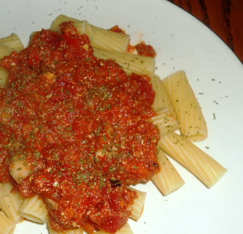 6. Put rigatoni on a plate, add the sauce, and top with Parmesan cheese.